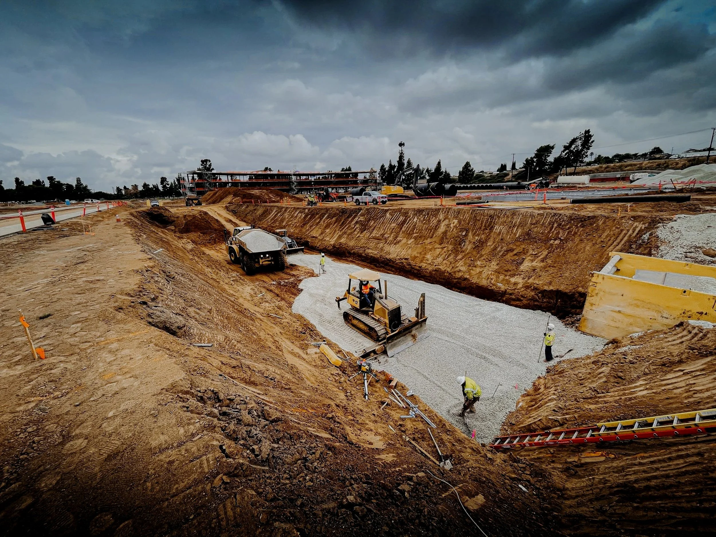 Van Diest Bros., Inc.'s work included a 96-inch storm drain detention system installed nearly 30 feet deep, two major storm-water pump stations, HDPE storm drain networks, modular wetland vaults, and new domestic water, fire water, and sewer services.